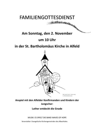 02. Nov Veranstaltung Alfeld · Kauerheim · Kegelheim · Kursberg · Lauterhofen · Lieritzhofen · Lieritzhofen · Nonnhof · Pollanden · Schupf · Seiboldstetten · Thalheim · Waller Herzliche Einladung zum Familiengottesdienst am kommenden Sonntag in Alfeld Evangelische Kirchengemeinde Alfeld Posted on 27. Okt 2025 Add to calendar zu Google Kalender hinzufügen iCalendar Outlook 365 Outlook Live Details Datum: 2. November Zeit: 10:00 - 11:00 Veranstaltung-Tags:Familiengottesdienst Veranstaltungsort Kirche St. Bartholomäus Marktplatz 6 Alfeld, 91236 Veranstalter Evangelische Kirchengemeinde Alfeld Phone 09157/ 226 E-Mail pfarramt.alfeld@elkb.de View Veranstalter Website