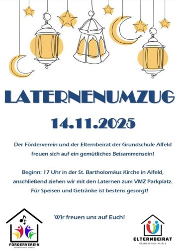 Der Elternbeirat und der Förderverein der Grundschule Alfeld e.V. laden herzlich zum Laternenumzug am 14.11.2025 ein.